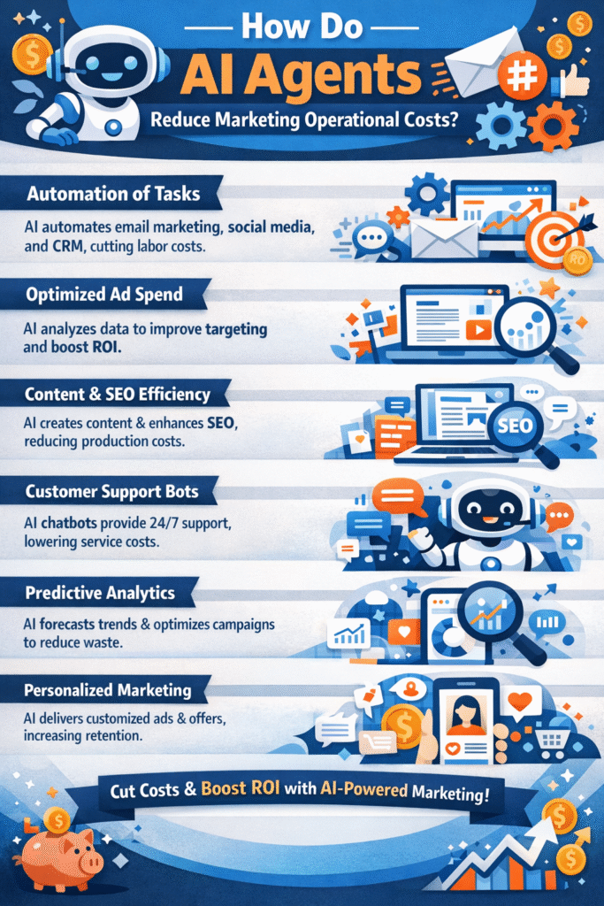 Artificial intelligence is rapidly transforming the digital marketing landscape, and businesses are increasingly asking one important question: how do AI agents reduce marketing operational costs? In today’s competitive environment, brands are under pressure to increase ROI while keeping expenses low. AI-powered marketing tools provide a practical solution by automating repetitive tasks, improving campaign performance, and enabling data-driven decision-making. By integrating AI marketing automation into daily operations, companies can significantly cut marketing operational costs without sacrificing growth.